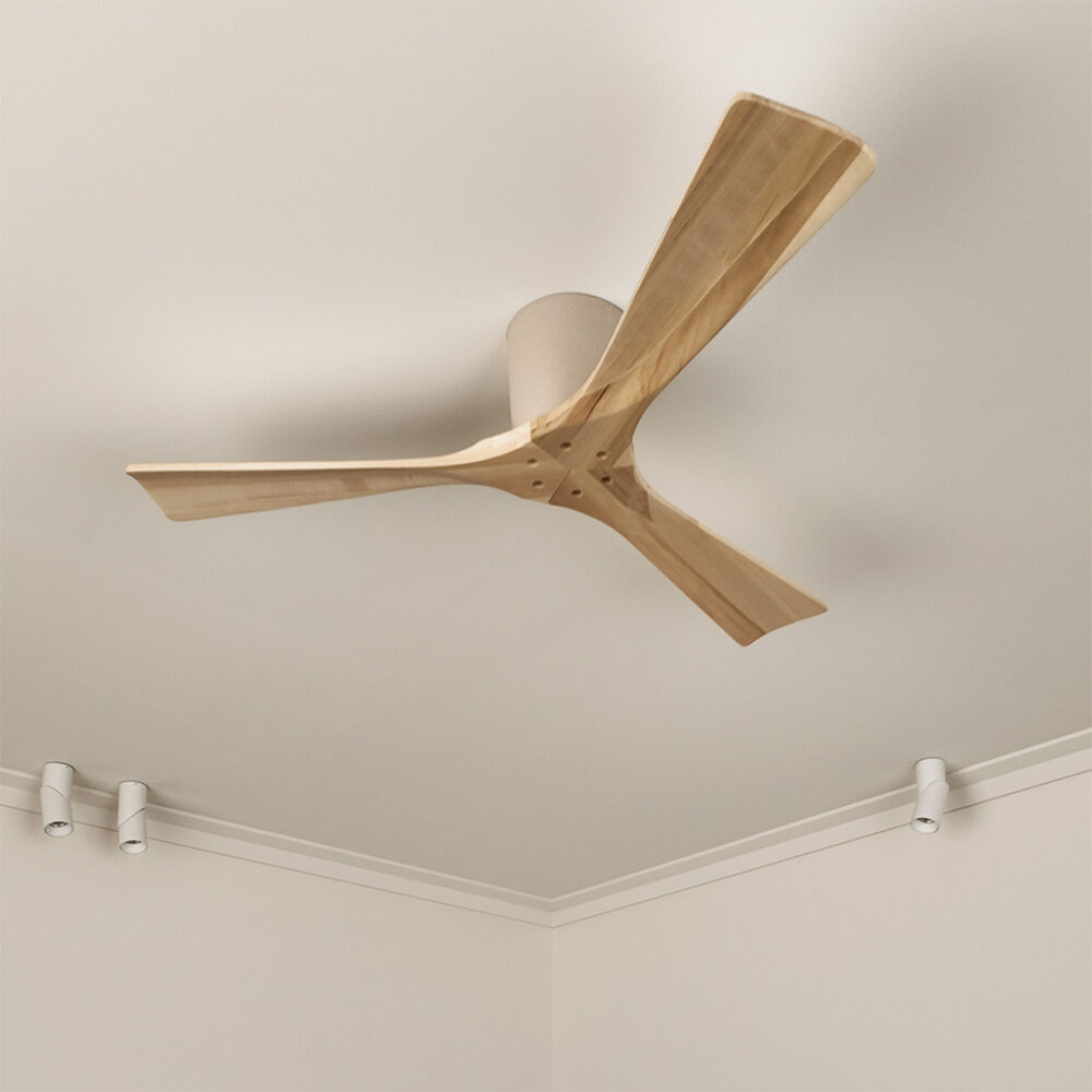 Despite its low profile, performance is not compromised. The energy-efficient DC motor consumes as little as 1 watt on the lowest speed in the 48″ model, delivering quiet, economical operation for overnight use. With six selectable speeds and airflow reaching up to 14,870 m³/hr in the 54″ model, the Gaia proves that a compact ceiling presence can still deliver powerful, controlled airflow when required. Available in 48″ and 54″ sizes, with no-light, light-adaptable base cap, or integrated CCT LED light options, the Gaia offers flexibility while maintaining its low profile silhouette. Backed by an 8-year motor warranty, it represents a durable and forward-thinking choice for homeowners seeking a sustainable, efficient, and visually refined low profile ceiling fan.
