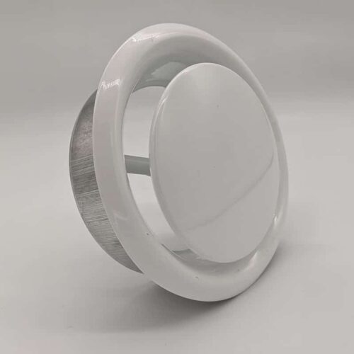 A circular cone vent typically used for internal ceiling or wall installation. The cone vent has a centre piece which is adjustable – meaning if you rotate the centre piece it will open or close the vent. It comes in white only and this listing is for the metal model.