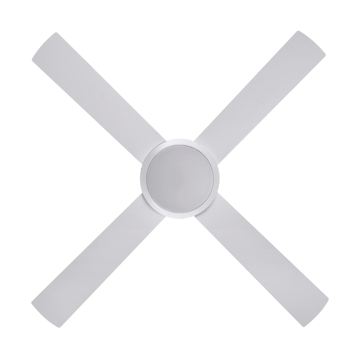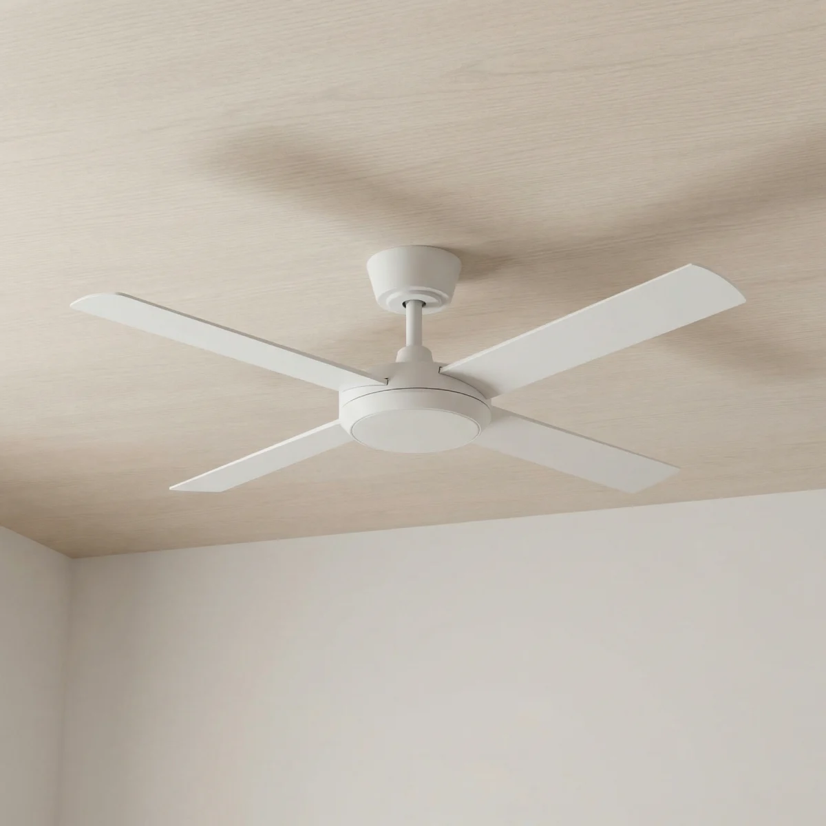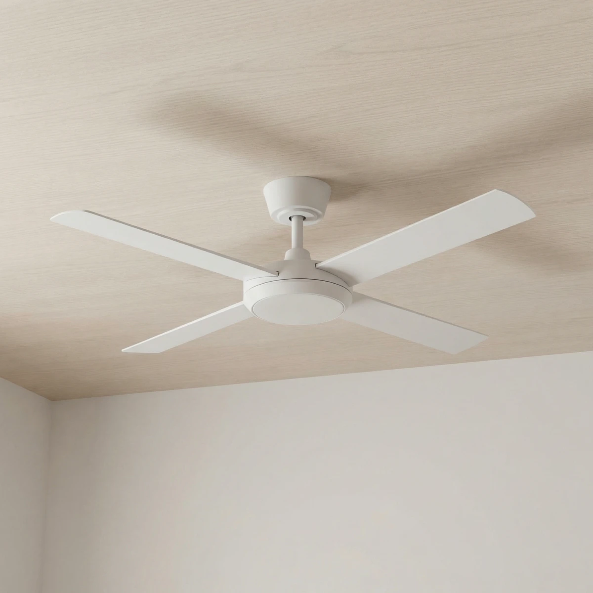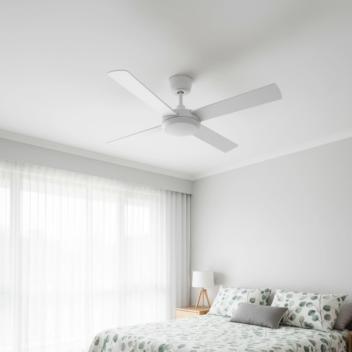 The fan includes a 6-speed remote control with a built-in timer that can be set for 1, 4, or 8 hours, along with a Summer/Winter reverse function for year-round airflow. It is suitable for indoor use, coastal locations, and covered outdoor areas.