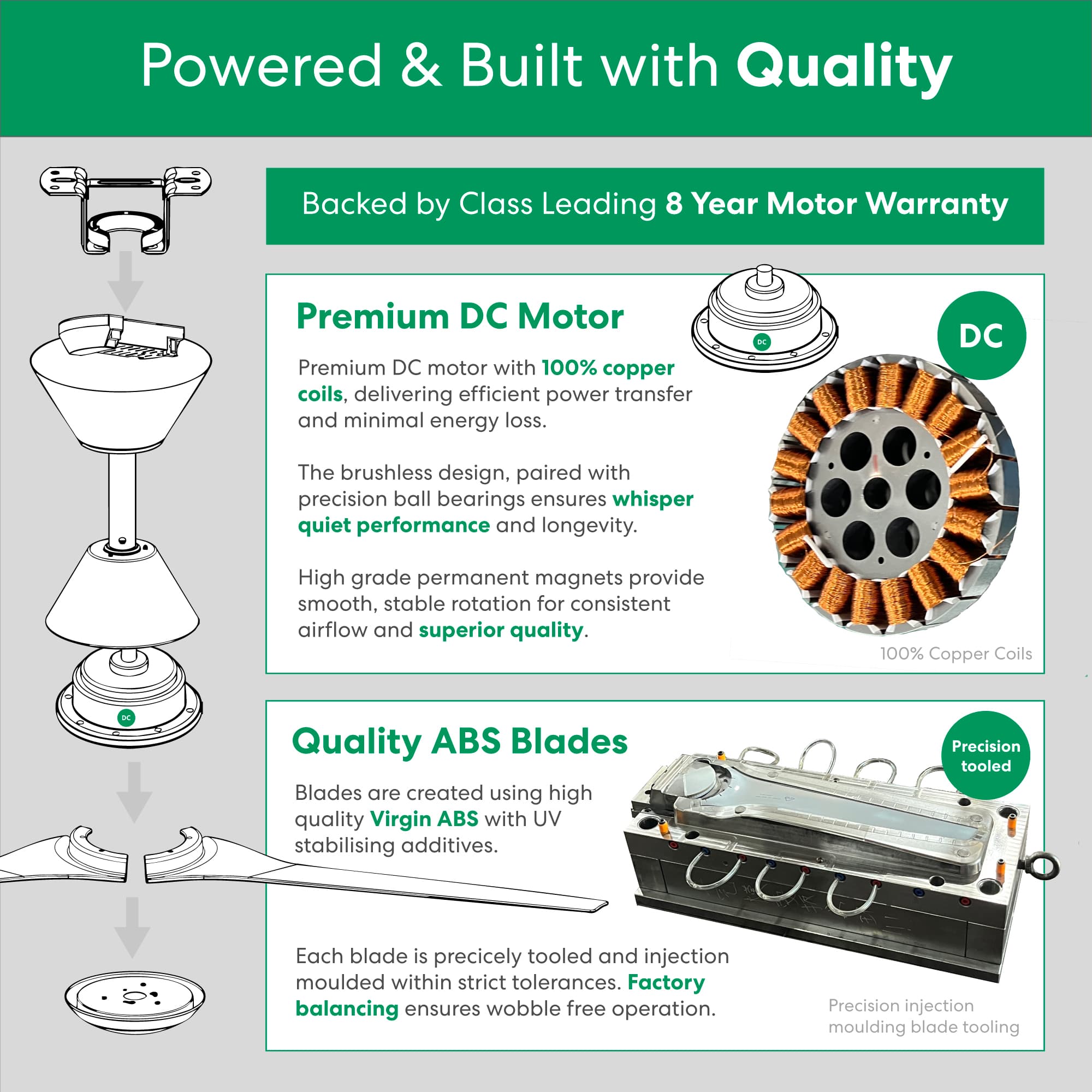 The efficient DC motor offers 6 speeds with outputs ranging from 60 to 230 rpm, and a minimal 20.2w power consumption. The speeds can be controlled with either the remote or with the smart app. Included with a fan timer with 1-9 Hour settings.