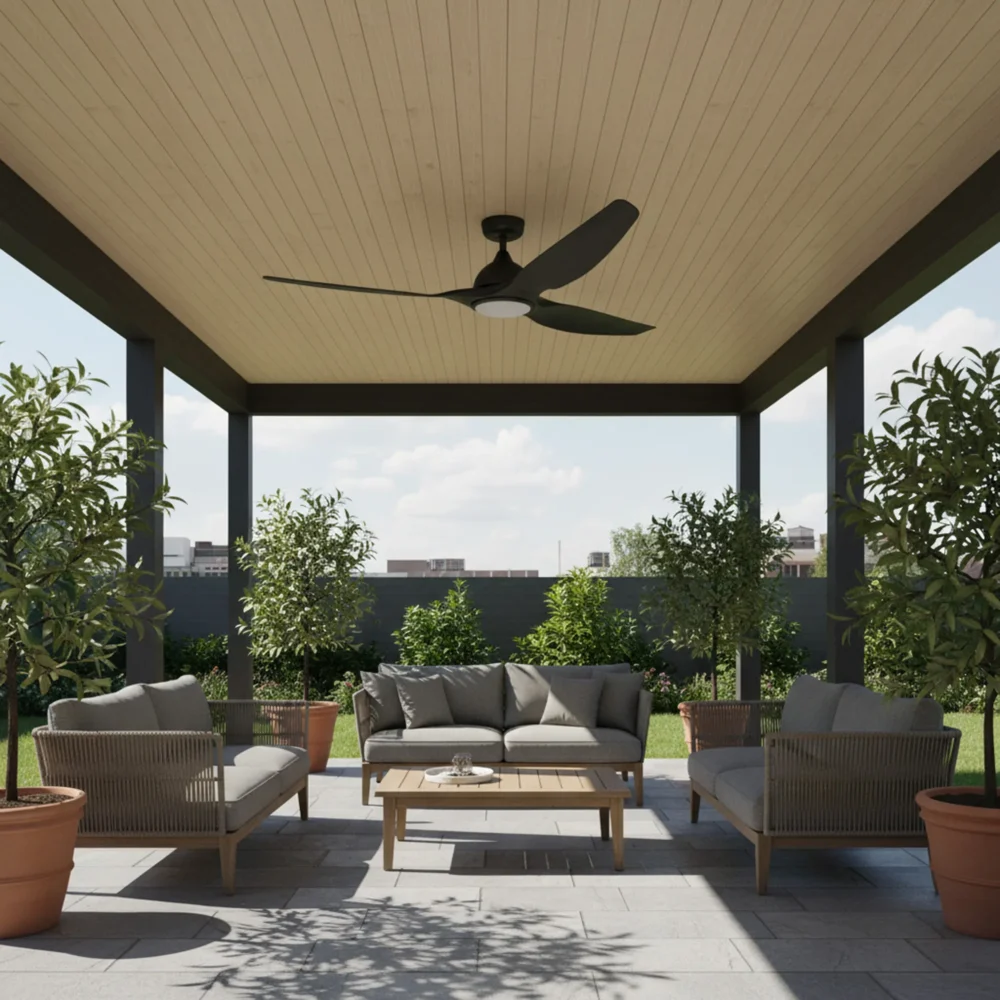 The airflow required depends on the size and exposure of your outdoor area. A smaller, sheltered alfresco may only need moderate airflow, while larger patios or open decks often need high-output models to circulate enough air effectively. While airflow ratings such as cubic metres per hour (m³/h) are useful, the true measure is how the fan feels during use, providing cooling without overwhelming the space.